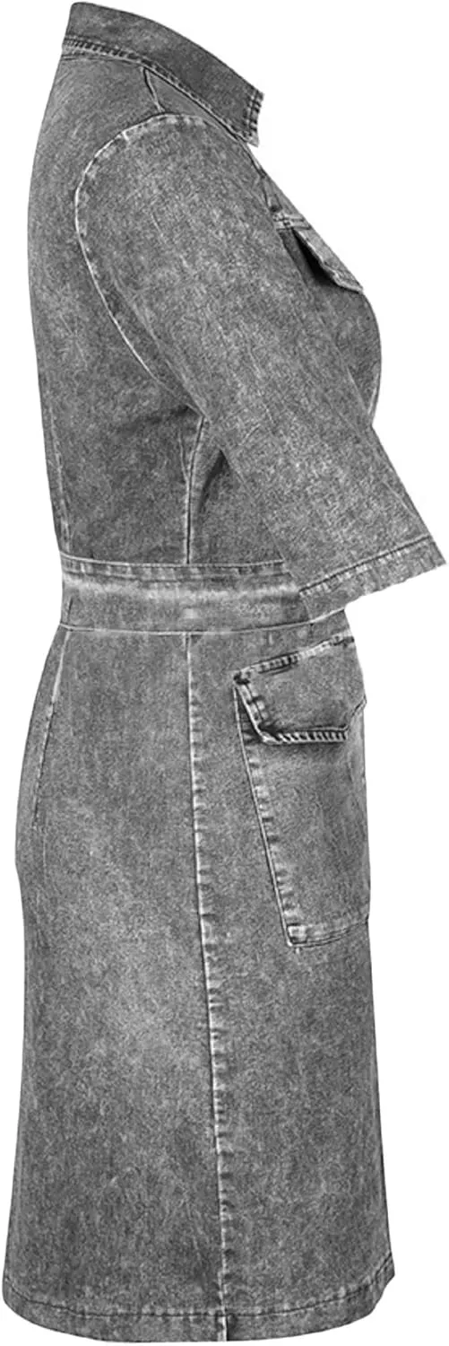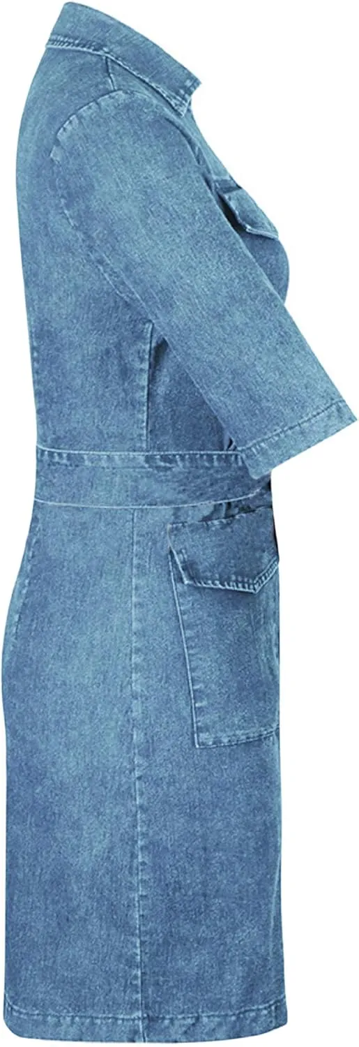 Women's Bodycon Lapel Collar Front Zip Bow-Tie Pockets Mini Denim Dress